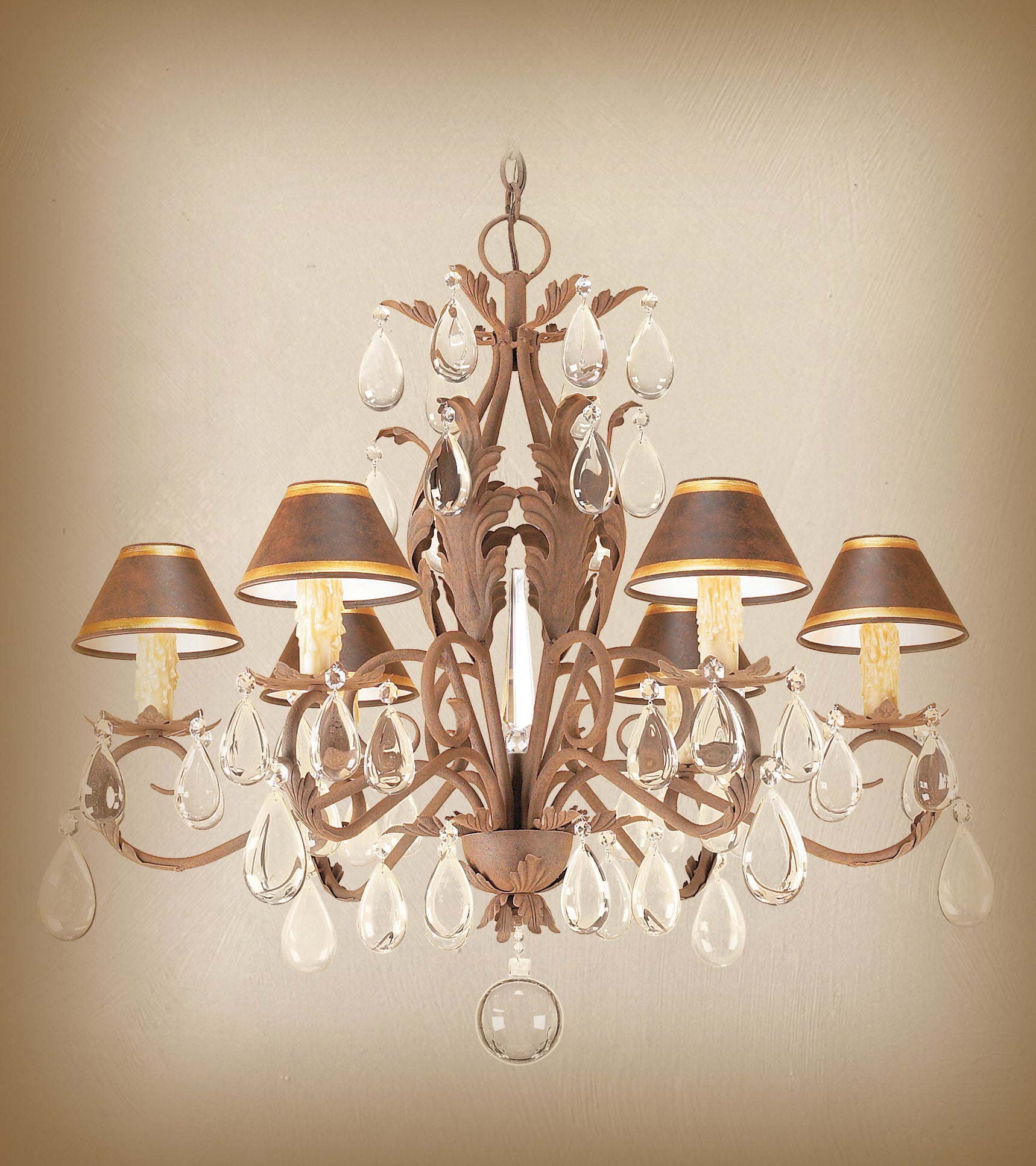 This hand-forged wrought iron chandelier is beautifully decorated with hand-cut European crystals sure to complement any formal setting. Each crystal is meticulously hand-applied to enhance its elegance.