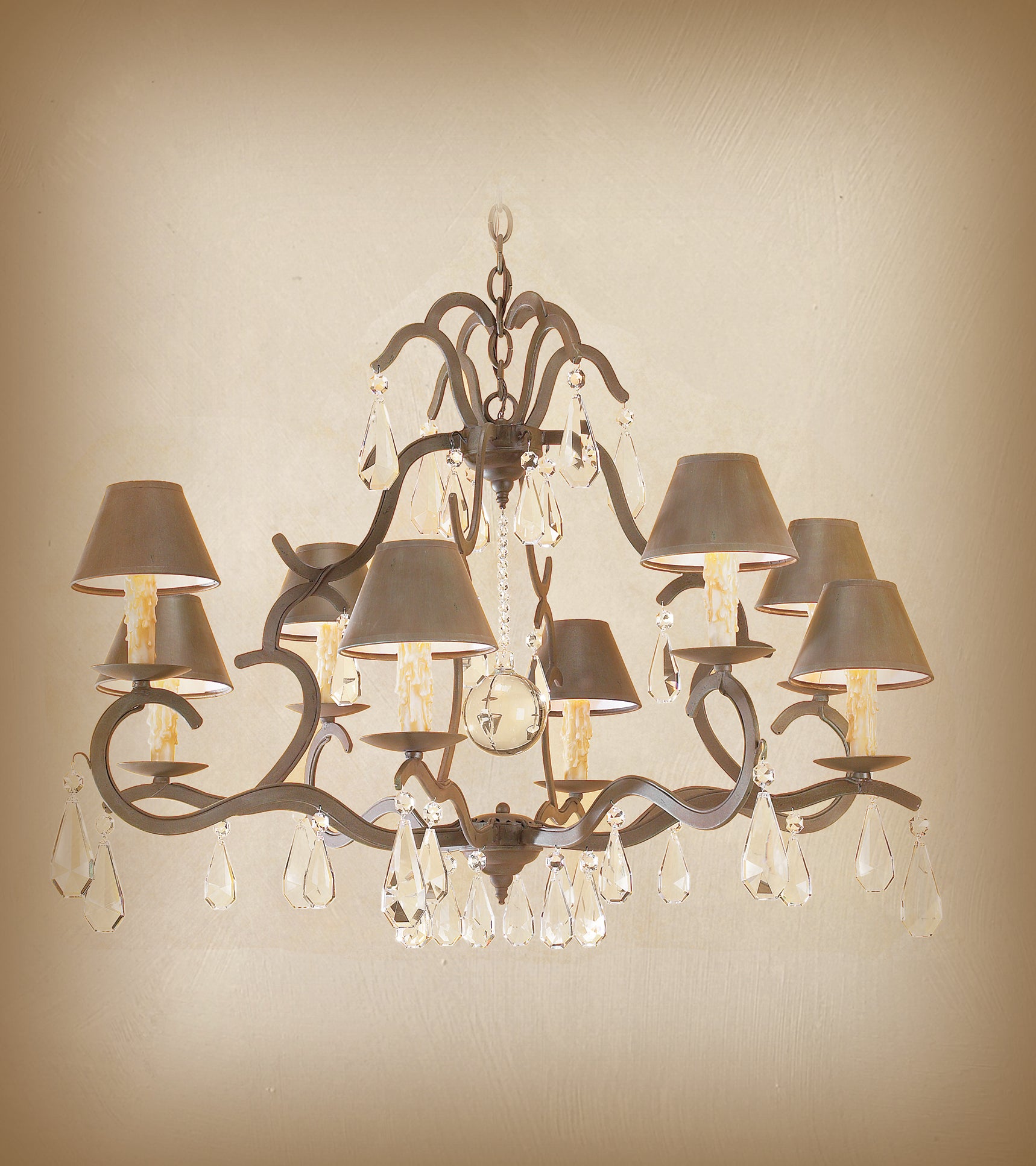 This hand-forged wrought iron chandelier is beautifully decorated with hand-cut European crystals sure to complement any formal setting. Each crystal is meticulously hand-applied to enhance its elegance.