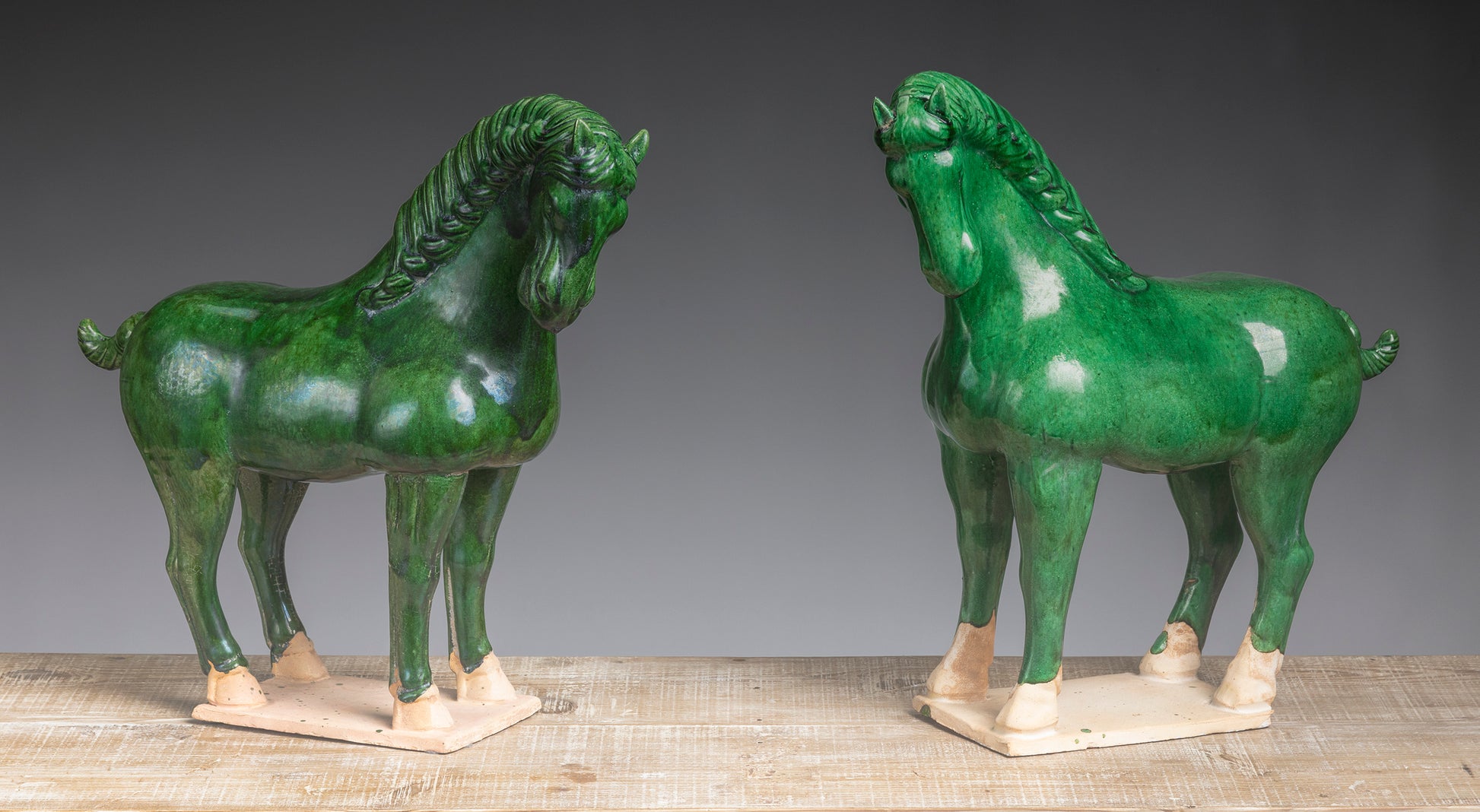 These hunter green ceramic horses are a unique and stylish addition to any home decor. The intricate details and elegant design make them perfect for displaying on a mantel or bookshelf. Their timeless appeal ensures they will be cherished for years to come.